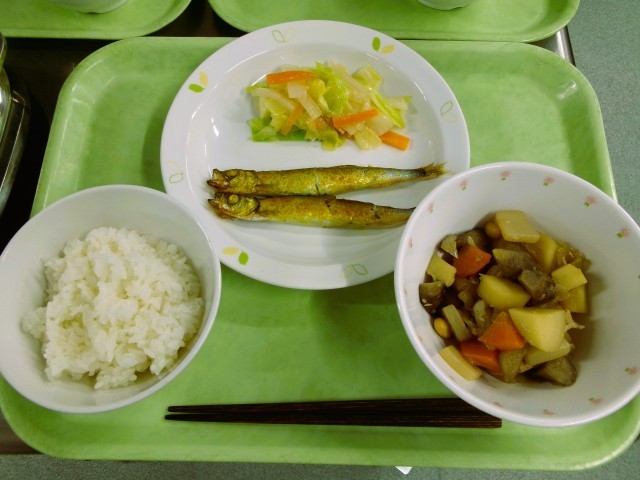 ごはん(有機米) 牛乳 ししゃものカレー焼き がめ煮 野菜のみそあえ