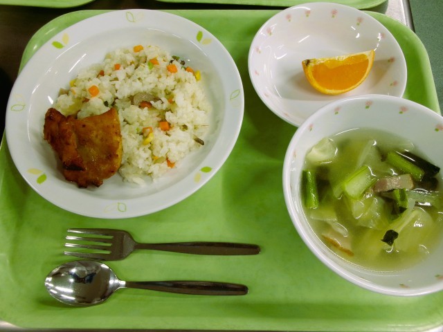 ピラフ 牛乳 タンドリーチキン風 野菜とベーコンのスープ くだもの(清見オレンジ)
