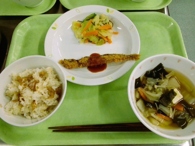 たけのこごはん 牛乳 ししゃものフライ キャベツの塩こんぶかけ 豆腐汁