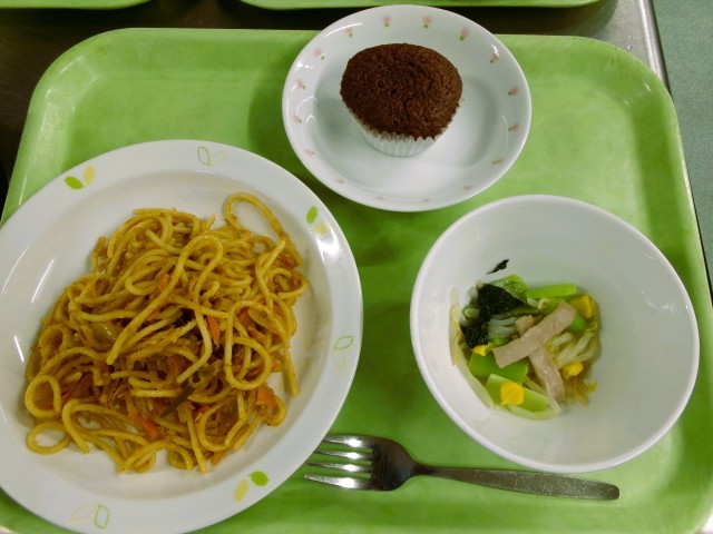 トマトとツナのスパゲッティ 牛乳 トウモロコシのサラダ ココアケーキ