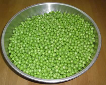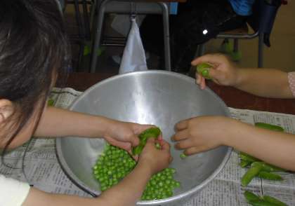 今日の給食はグリーンピースごはんです。1年生がさやむきをしました。
