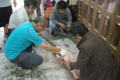 今日は親児フェスティバルの日です。朝7時半から学校に集まって、準備が始まりました。あいにくの天気なので、有名なブタの丸焼はピロティで行うことになりました。PTAの校外さんたちも豚汁のお手伝いです。焼かれる前の豚を見て、みんなびっくりしていました。とっても苦労して、丸焼の準備ができました。