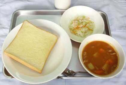 バタートースト 牛乳 トマトシチュー キャベツサラダ