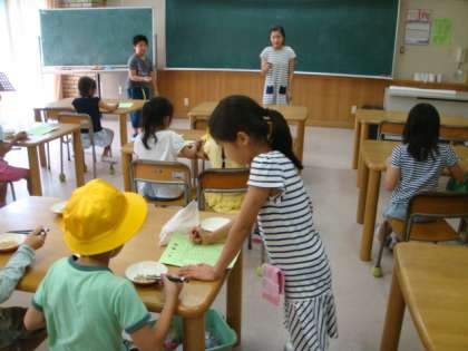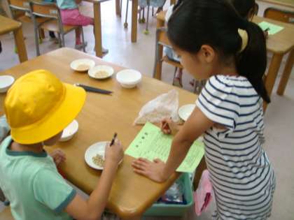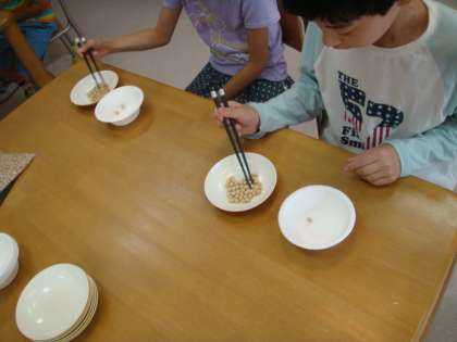 みんなはお箸を慎重に使いこなし、大豆を皿から皿へ、一粒一粒確実に運びました。中には、食育委員会のおねえさん、おにいさんから「合格ー!」という言葉をもらい、「やったー!」と大喜びをする児童もいました。