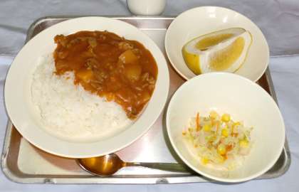 ハッシュドポークライス 牛乳 コーンサラダ くだもの