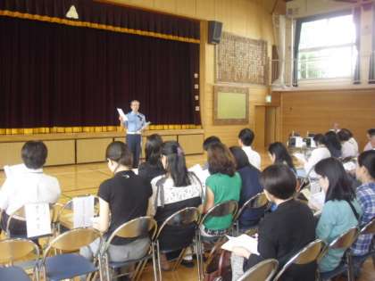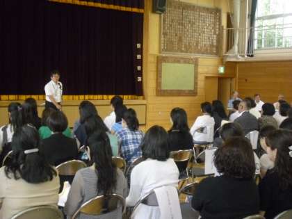 昨日、本校体育館で、北沢警察署管内 地域環境連絡協議会情報交換会が行われ、たくさんの学校のPTA方々が集まりました。北沢署の方からは、この地域の実態に即した事故や犯罪の状況のお話を聞くことができました。「危険は心の中に潜んでいる」この言葉が印象的でした。また、事前アンケートをもとに、たくさんの学校の安全対策について情報交換ができました。用賀小のヘルメット着用率90%のお話しに、話題が沸騰していました。