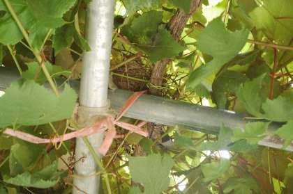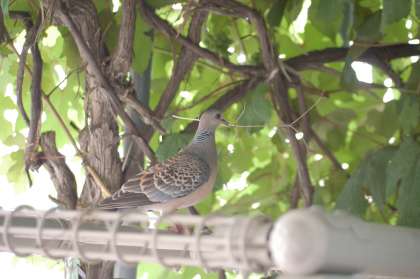 校長室前のブドウ棚の中に、キジバトが巣を作っています。