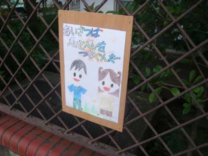 先日、地域の方からこのポスターを貼る額縁(板)の寄付がありました。有難くいただいたボードに「あいさつポスター」を貼りなおし、掲示しなおしました。