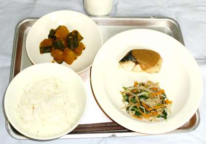 ごはん 牛乳 魚のピり辛ソースかけ おひたし かぼちゃの含め煮