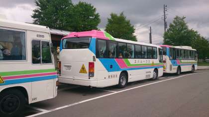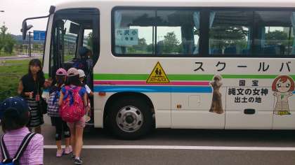 舟形小学校のスクールバスで、舟形の子どもたちが待つ舟形小学校へ。
