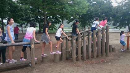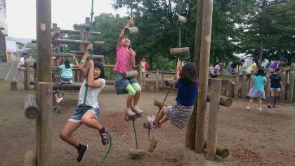 広い校庭や、アスレチックでグループごとに遊びます。やっぱり遊びは仲良くなるための最短距離ですね。