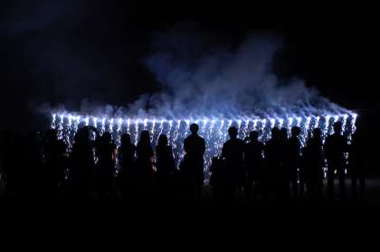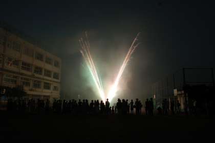 前半は、手持ち花火です。校庭に煙の中にたくさんの花が咲き、