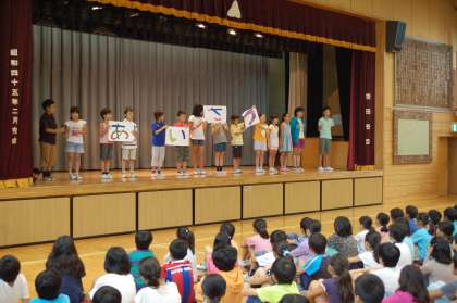 代表委員会の子どもたちが「あいさつ集会」をひらき、あいさつの合言葉をみんなに伝えていました。