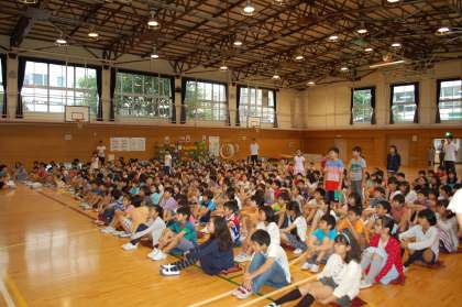 あいさつ集会の後、今年の夏のプール皆勤賞の子どもたちが紹介されました。