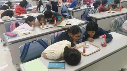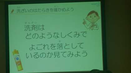 どうして油汚れが落ちるか、実験で確認しました。洗剤をたらした時の変化に、みんな驚いていました。