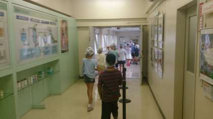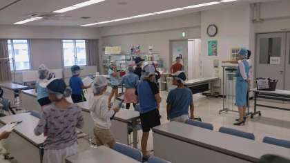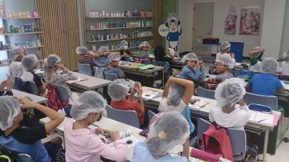 工場見学出発。髪の毛が落ちないように、完全防備。工場内は撮影禁止なので、子どもたちから様子を聞いてくださいね。