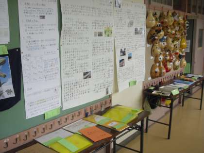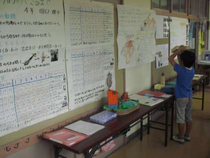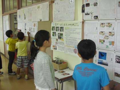 今、代沢小学校の、各教室前の廊下の掲示板には、夏の「自由研究」が展示されています。秋の長雨、みんなは作品をみてまわっています。