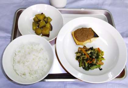 ごはん 牛乳 魚のごまだれかけ さつまいもの含め煮 煮びたし
