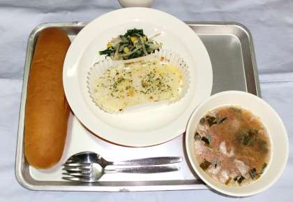 黒砂糖パン 牛乳 ポテトクリーム焼き 青菜のソテー ミネストローネ