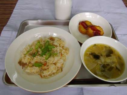 子ぎつねごはん 牛乳 豆腐のナゲット みそ汁