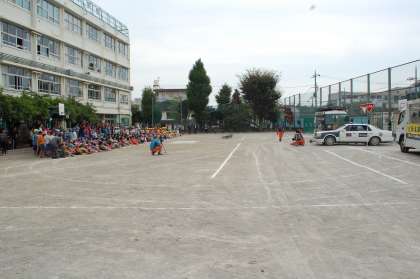 土曜学校公開日に合わせて、地域環境連絡協議会のPTAの方々が、スケアードストレート交通安全教室を企画してくださいました。実際の交通事故現場をスタントマンの方々が再現することで、事故からどうやって身を守るかを教えてくれる教室です。進行が子どもたち向けにやわらかい雰囲気で進めてくださっているので、安心して学ぶことができました。