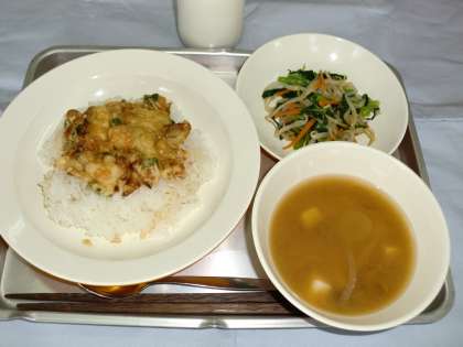 かきあげ丼 牛乳 なめこのみそ汁 おひたし
