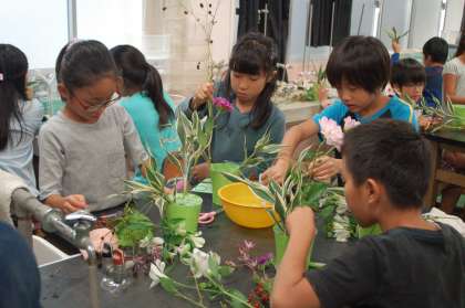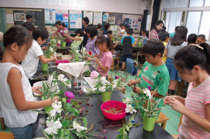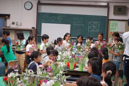 毎月花を生ける日に、子どもたちに花の生け方を指導してくださる佐藤先生が、4年生全員にフラワーアレンジメント教室を開いてくださいました。ホトトギスやワレモコウなど秋のお花を中心に一人ひとり全員がフラワーアレンジメントに挑戦です。先生は、このアレンジメントをとおして、花の命、個性を大切にするというメッセージを子どもたちに伝えてくれました。まさに、命の教育の時間でした。子どもたちの作品は、それぞれの個性が輝くすばらしいものになりました。佐藤先生をはじめご指導くださった先生方、そして大田市場ワンコインクラブの皆様に感謝いたします。ありがとうございました。
