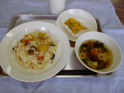 *秋の香りごはんは、さつまいも、くり、しめじなど、