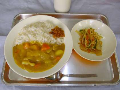 チキンカレーライス 牛乳 福神漬 こんにゃくサラダ
