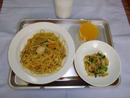 五目焼きそば 牛乳 ナムル みかんゼリー