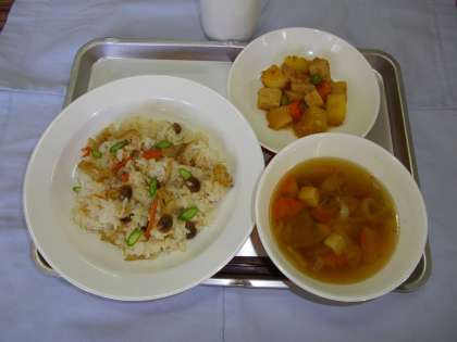 しめじごはん 牛乳 じゃがいものそぼろ煮 けんちん汁