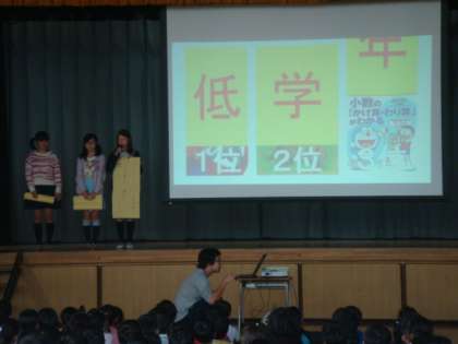クイズ形式を取り入れた楽しい発表会でした。全校のみんなにとって、本の魅力を改めて確認し合う良い機会となりました。