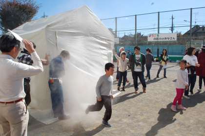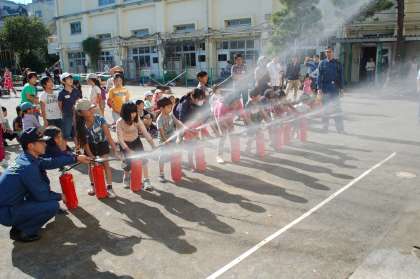 午後には消防庁の方々が来てくださり、「煙中訓練」「消火器体験」「タンカー講習」そして「バケツリレー体験」をしました。