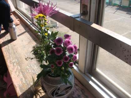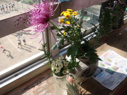 今月の花は「キク(キク科)」「ローズマリー(シソ科マンネンロウ属)」「スプレーマム(キク科)」「チランジア(アナナス科チランジア属)」でした。