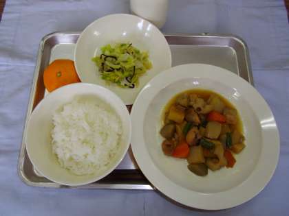 ごはん 牛乳 がめ煮 キャベツの塩こんぶかけ くだもの