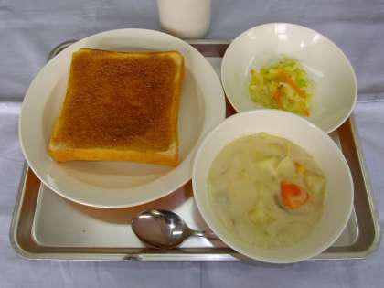 シナモントースト 牛乳 クリームシチュー キャベツサラダ