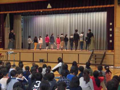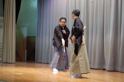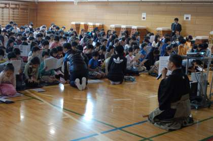これは、代表児童による『すり足』と、能における『殺陣(たて)』のお手本をみせていただいている場面です。