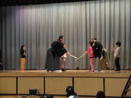 これは、代表児童による『殺陣(たて)』の指導を受けている場面と、6年生代表児童による『お礼の言葉』を伝えた場面です。