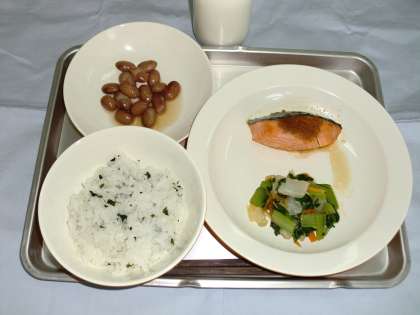 ごはん 牛乳 魚のステーキソース 野菜のおかかかけ 煮豆