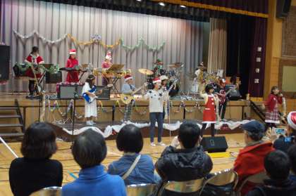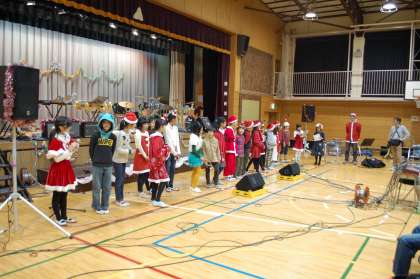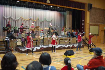 スターキッズのクリスマスコンサートが体育館で行われました。大人バンド、中学生バンドとみんなすごい腕前です。でも、小学生たちも負けず劣らず、頑張っていました。体育館中に熱いビートが響いていました。みんな、輝いていたよ!