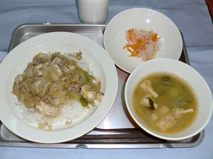 *給食の豚丼には、豚肉の他に糸こんにゃく、たまねぎ、焼き豆腐、