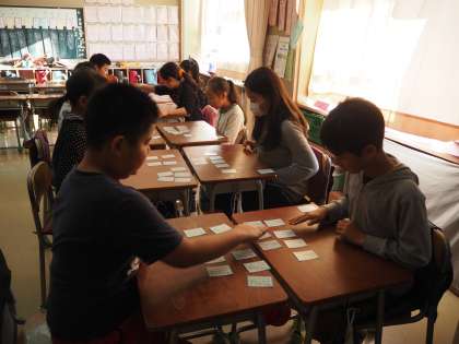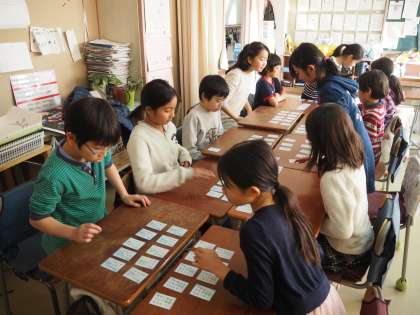 教科『日本語』にある「百人一首」の学習で、五色百人一首を使って行いました。