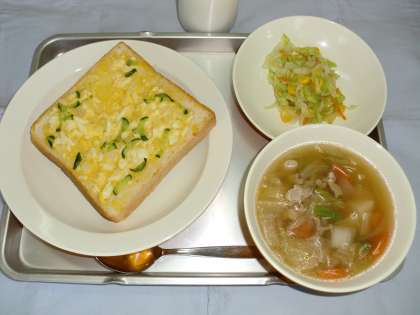 たまごトースト 牛乳 白いんげんの田舎風スープ コーンサラダ