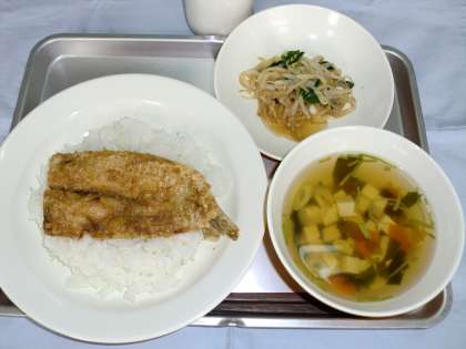 魚のかば焼き丼 牛乳 もやしのごま風味 すまし汁