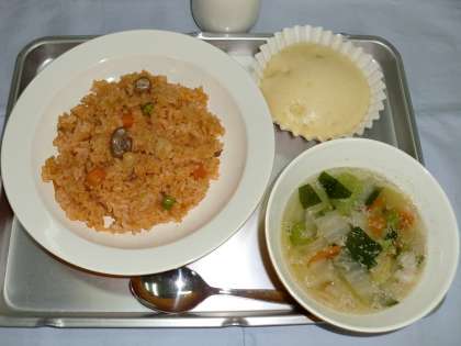 チキンライス 牛乳 白菜スープ りんご入り蒸しパン