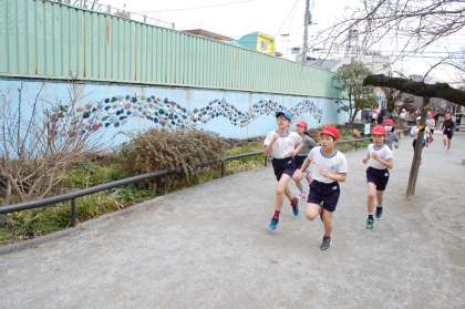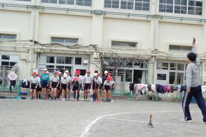 実施場所は、校庭、及び「せせらぎ公園」までの緑道でした。