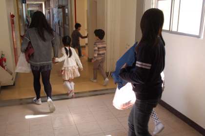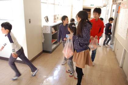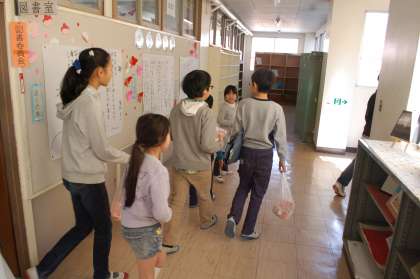 教室でお弁当を受け取り、縦割り班の教室へ移動しました。そして机の配置が済んだら、6年生を図書室へ迎えに行きました。