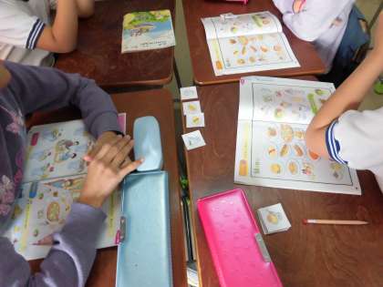 ねらいは「世界には様々な料理があることを知り、丁寧な言い方で欲しいものを訪ねたり言ったりする表現に慣れ親しむ。」でした。