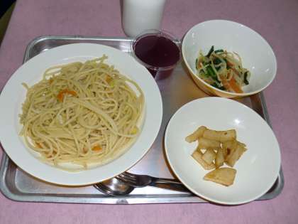 キャベツとツナのスパゲティー 牛乳 こまつなサラダ