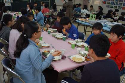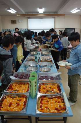 まず最初に。栄養士の先生からお話がありました。『「主食」「主菜」「副菜」「デザート」「飲み物」のバランスを考えて、お皿にとりましょう。』『量を考えてお皿にとりましょう。』『食べ残しは出さないようにしましょう。』の3つのお話でした。